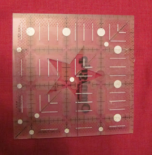 This is the fabulous Jo Morton fabric that have used in several of the other projects that I've shown this summer. I needed to cut squares that are 3.5" with the star centered. To make it easy, I used a 40% coupon to get a 3.5" ruler.I then traced one of the stars from the fabric onto template plastic and cut it out with a craft knife. Then I cut the plastic to 3.5" (centering the star) and taped it to the back of the ruler.